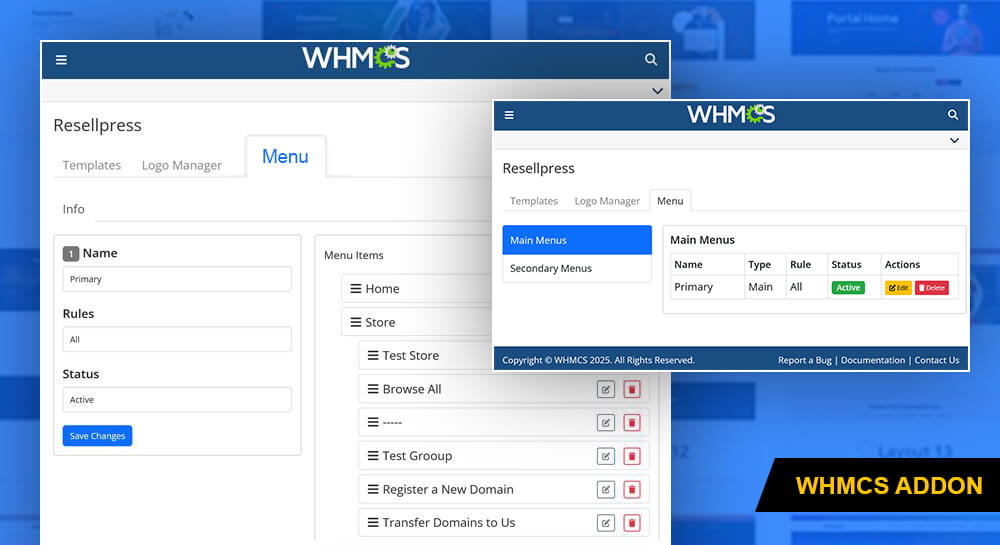 Say goodbye to complex WHMCS hooks for theme navigation modifications. Menu Manager offers a hassle-free solution, allowing you to effortlessly set up menu items directly from the WHMCS addon.